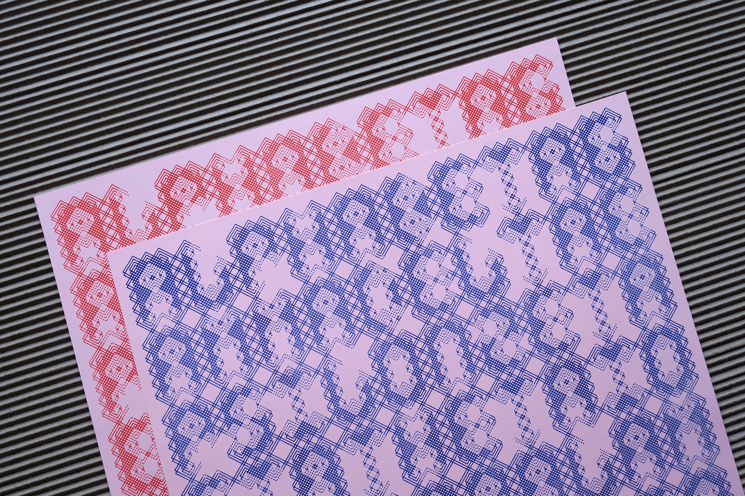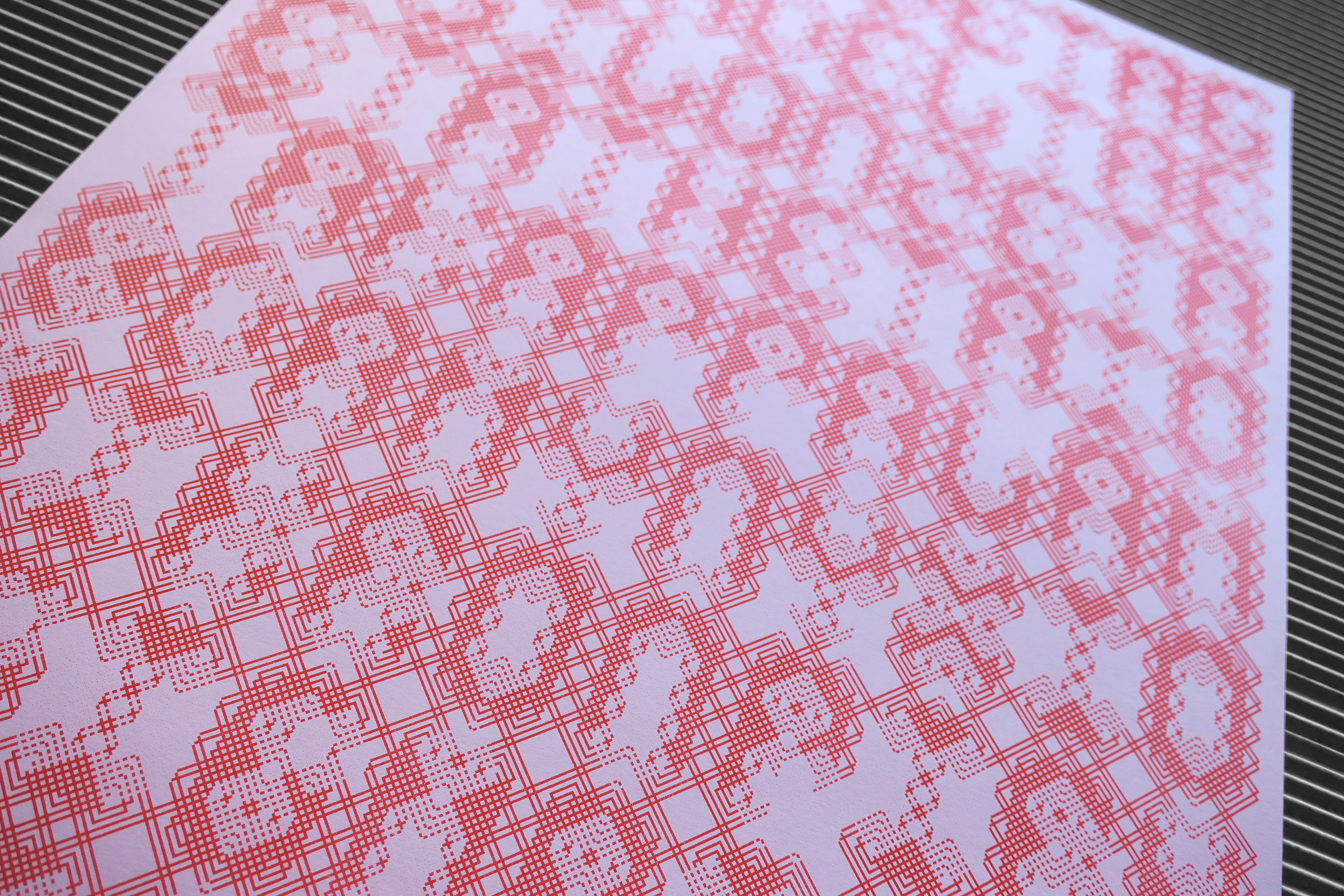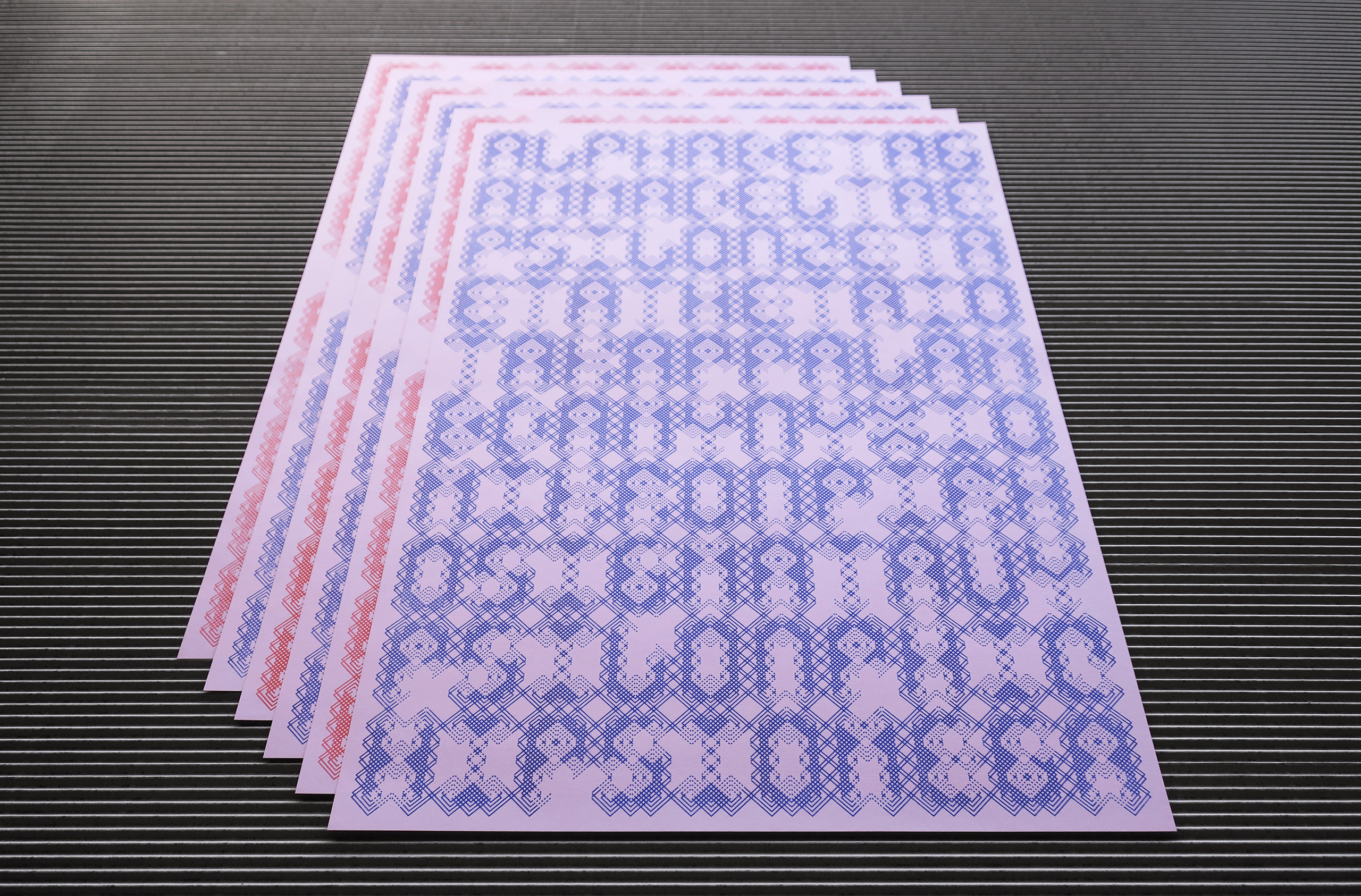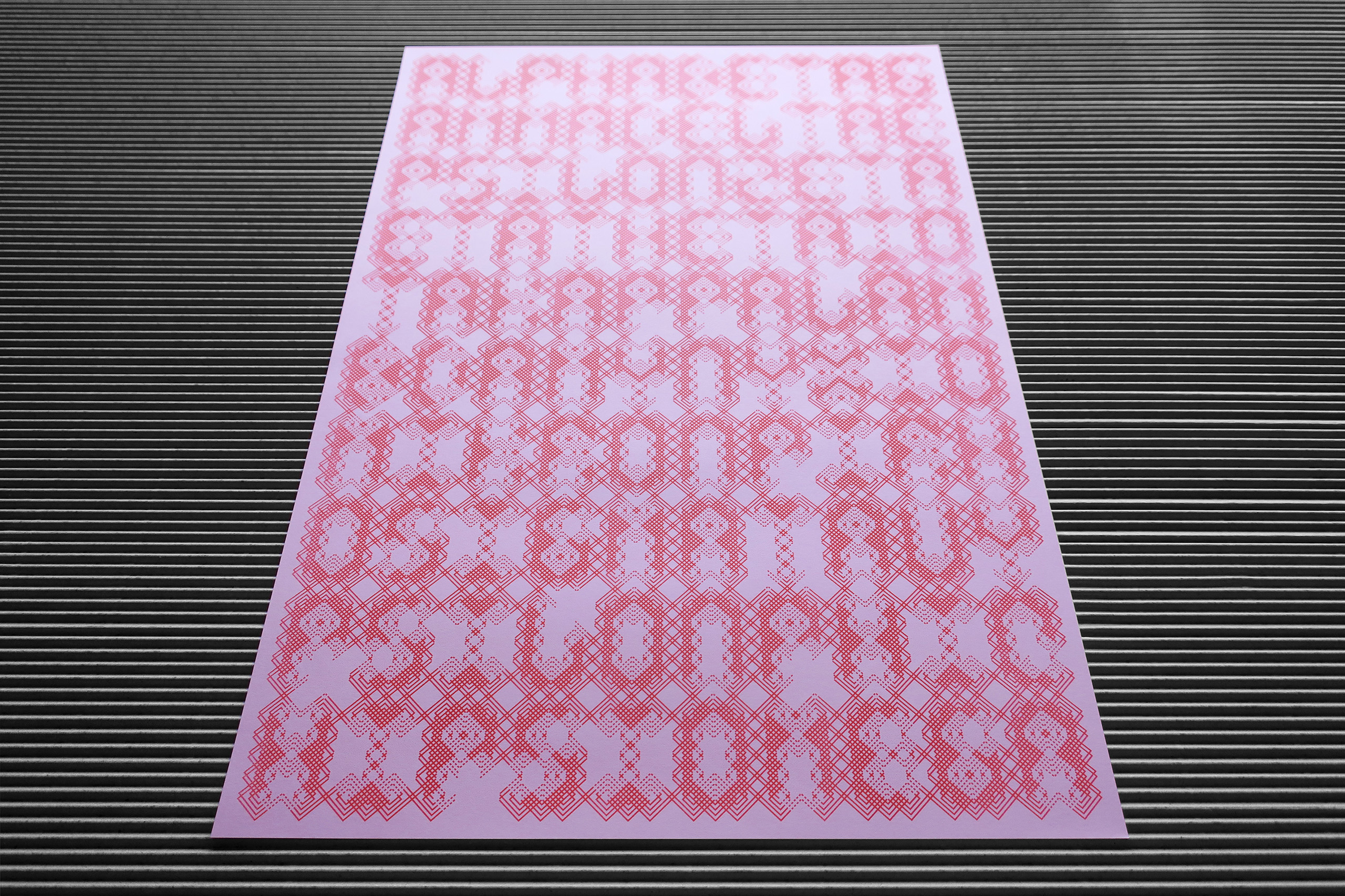 Die Gestaltung erfolgte im strengen Raster des »FLEXTRON Modular Font System« [ansehen] als Teil einer Reihe, zu der auch »100 Letters Moiré« [ansehen] und »100 Letters Endless Line« [ansehen] gehören. Ohne Leerstellen, Umbruchzeichen und Zeilenabstand ist der Satz an die geometrische Reduktion gleichbreiter Buchstaben angepasst: Der Text als kompakte Grafik mit technischer Aura, als stimmiges geschlossenes Konstrukt. Es entsteht eine komplexe Matrix aus Linien, die die Grenzen verschwinden lässt: Zwischen Zeichen und Ornament, Funktionalem und Abstraktem, Text und Bild ergibt sich eine offene Ebene am Rande der Lesbarkeit.